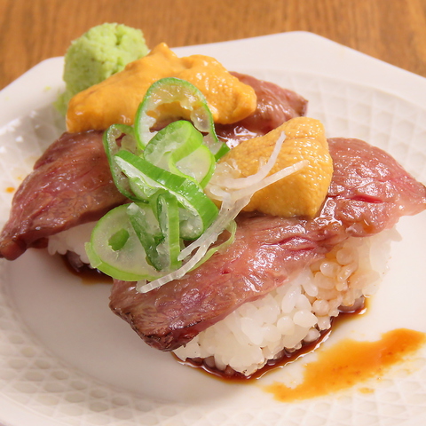 鳥海山麓と出羽丘陵に広がる豊富な草資源と清らかな水の絶好の自然環境で育った秋田由利牛は安心安全の絶品!当店では秋田由利牛をロース炙りや肉寿司として美味しくご提供しております。